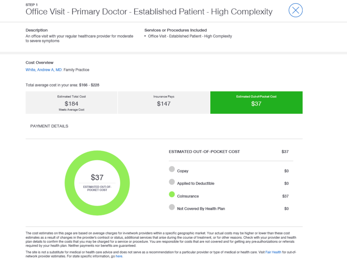 The cost estimates on this page are based on average charges for in-network providers within a specific geographic market. Your actual costs may be higher or lower than these cost estimates as a result of changes in the provider's contract or status, additional services that arise during the course of treatment, or for other reasons. Check with your provider and health plan details to confirm the costs that you may be charged for a service or procedure. You are responsible for costs that are not covered and for getting any pre-authorizations or referrals required by your health plan. Neither payments nor benefits are guaranteed. The site is not a substitute for medical or health care advice and does not serve as a recommendation for a particular provider or type of medical or health care.